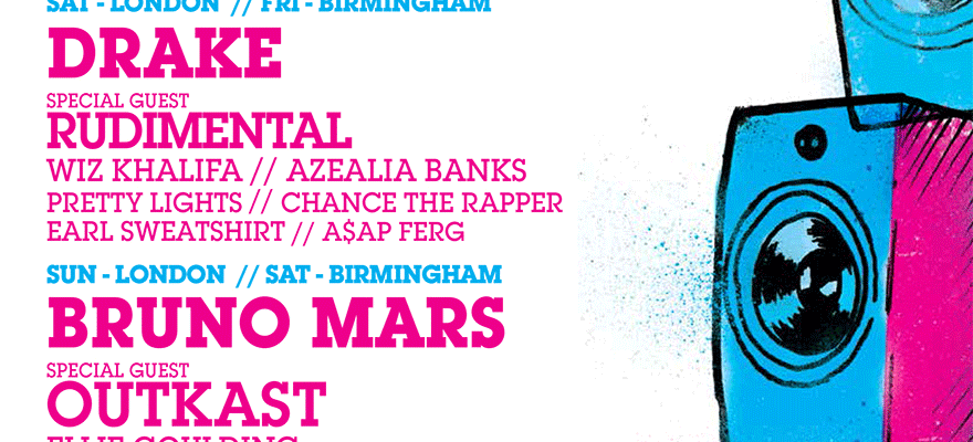 The line up includes headliners Kanye West, Drake and Bruno Mars as well as special guest performances from Pharrell Williams, Rudimental, Ella Eyre, John Newman and so many more.